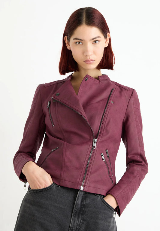 Ava Faux Leather Biker Jacket - Burgundy