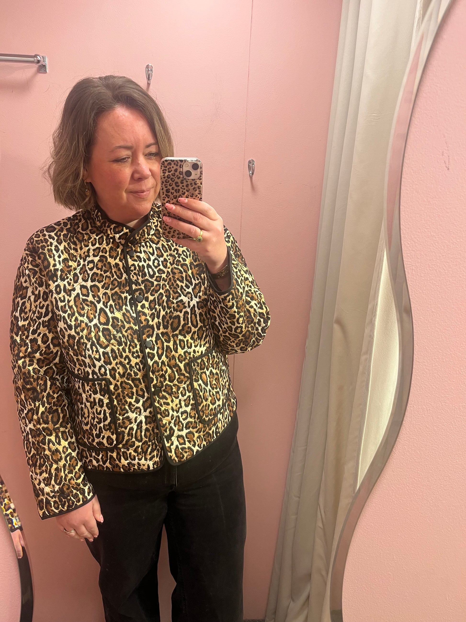 Take a walk on the wild side with our trans-seasonal quilted jacket in stand out leopard print!