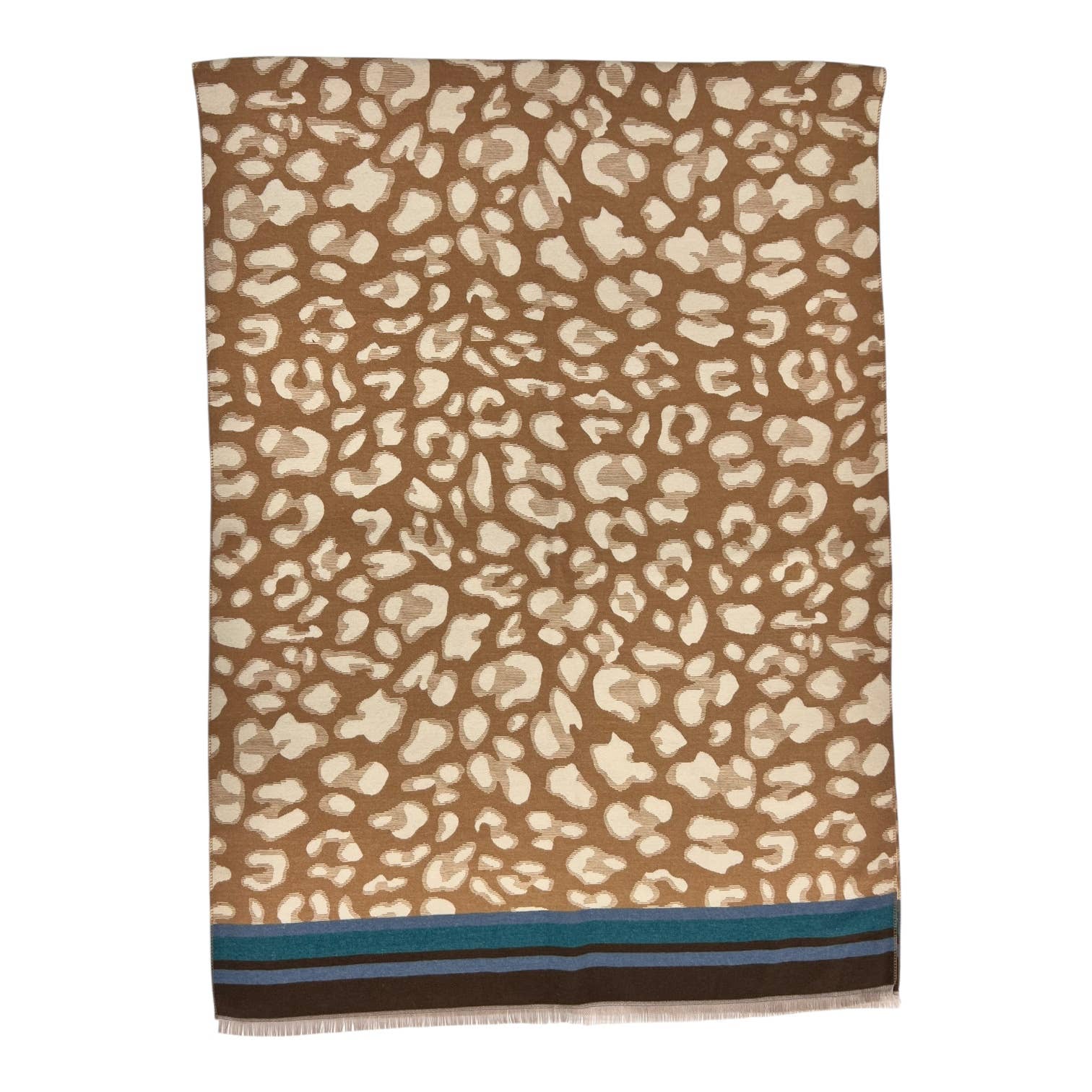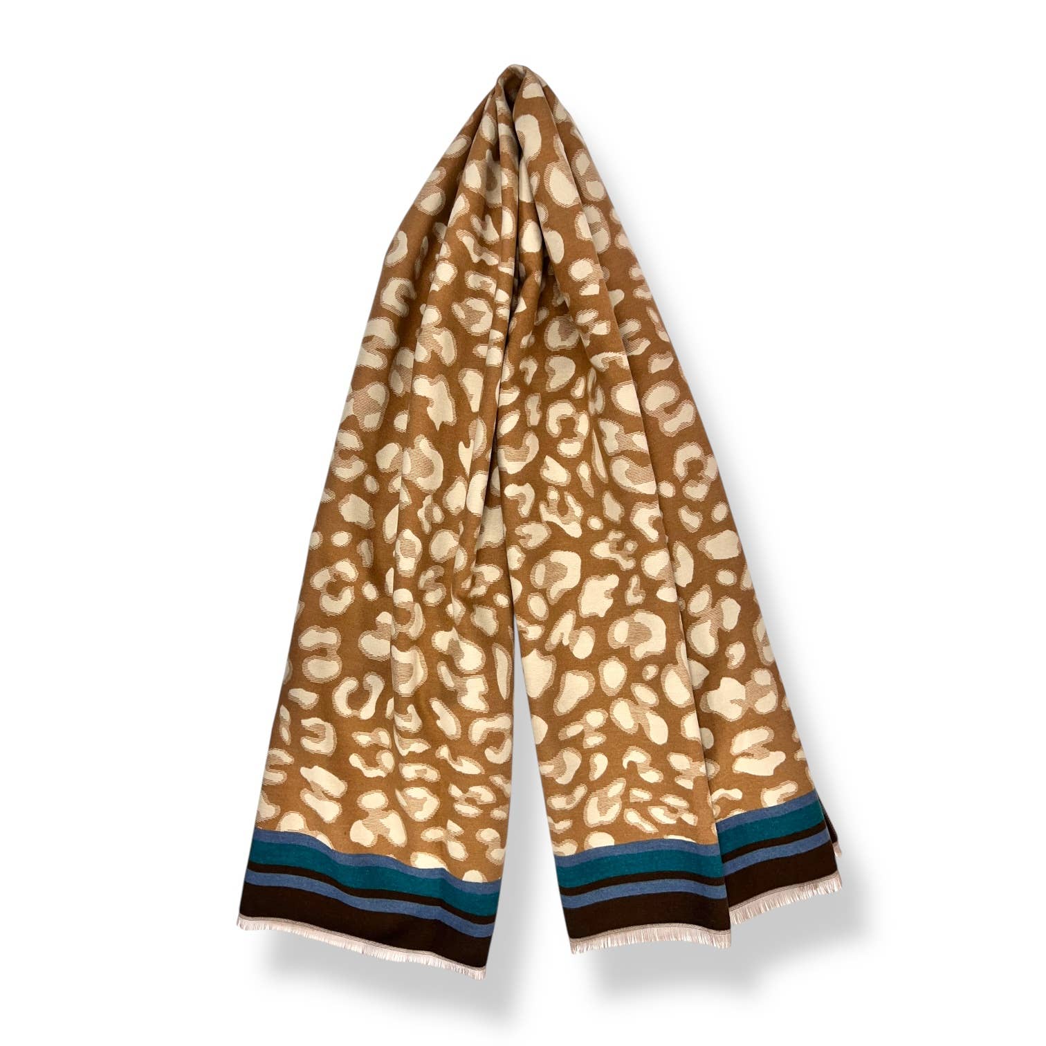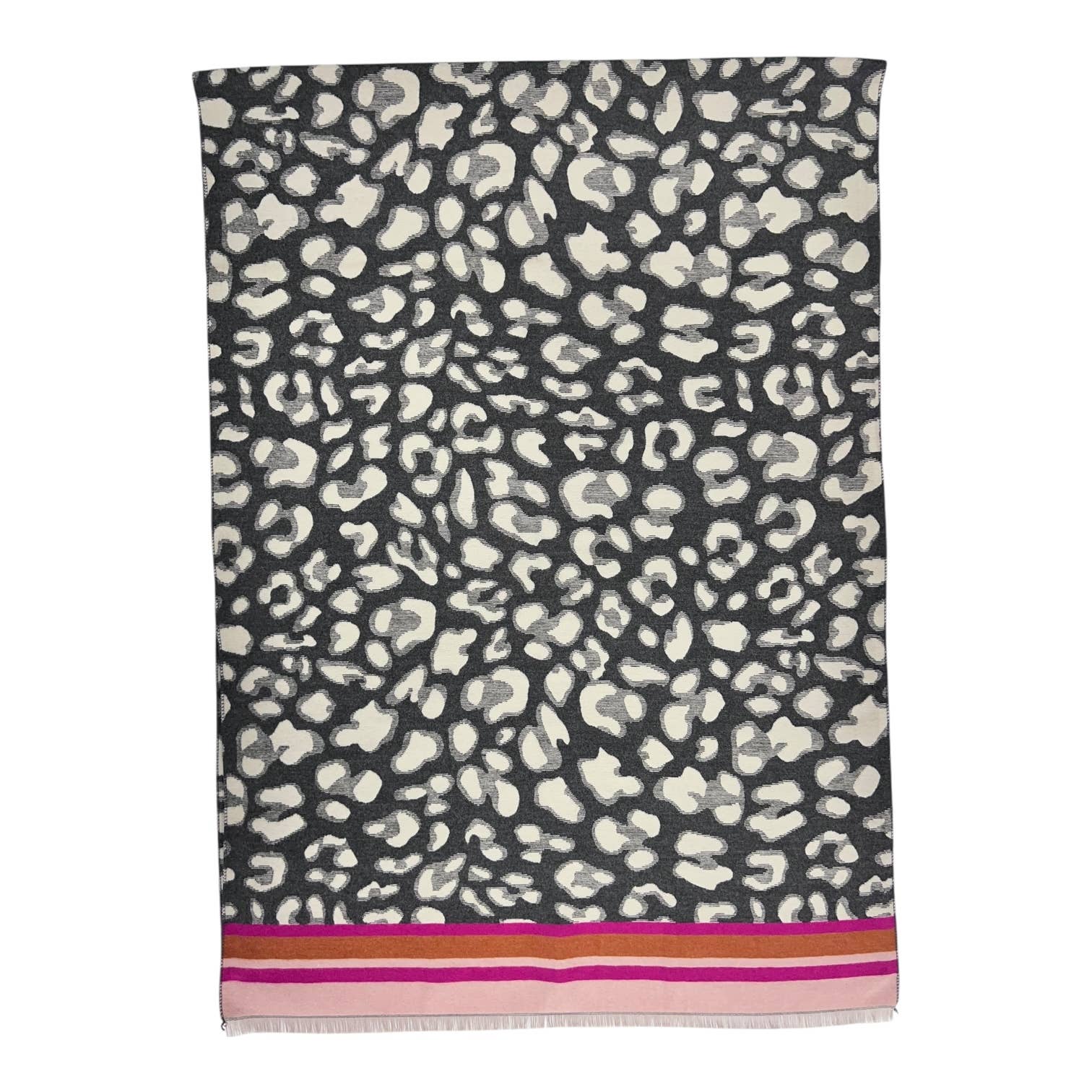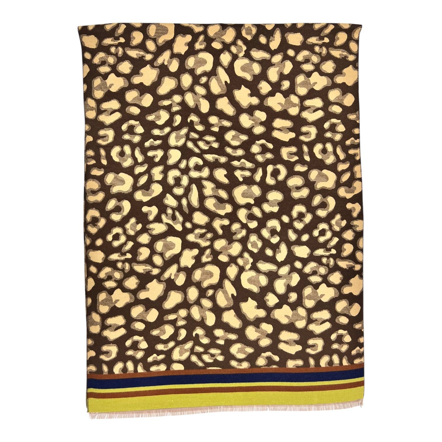 Leopard print with colourful border stripes on cashmere blend scarf. Scarf is finished with fringes and comes in 4 colour variations